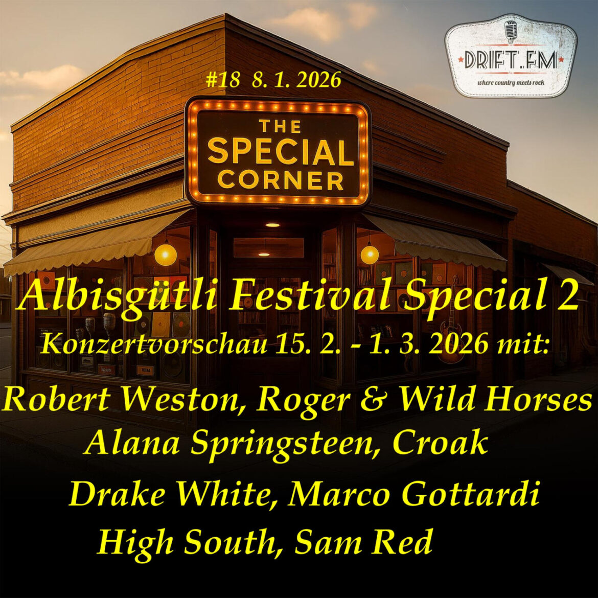 In dieser Ausgabe des Special Corners stellt Heinz Scheller die Acts vor, die in der zweiten Hälfte des Albisgütli Country Music Festivals – zwischen 15. Februar und 1. März 2026 – auftreten werden: Robert Weston, Roger & The Wild Horses, Alana Springsteen, Croak, Drake White, Marco Gottardi, High South und Sam Red.